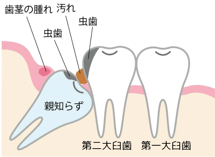 横になって生えてくると汚れが溜まりやすく、むし歯や口臭を誘発します。また、奥から歯を横に押してしまうため、歯並びを悪くする原因にもなります。